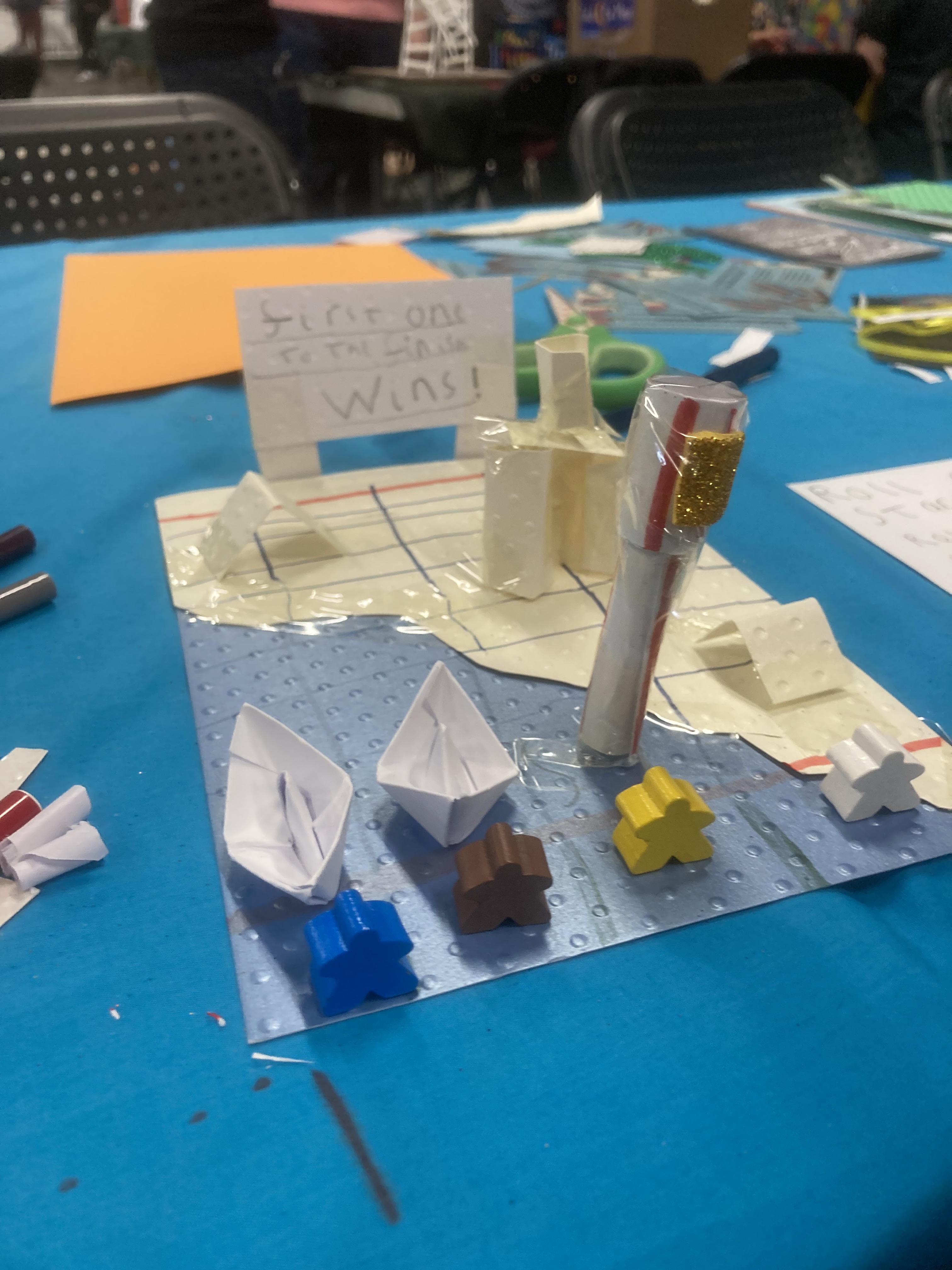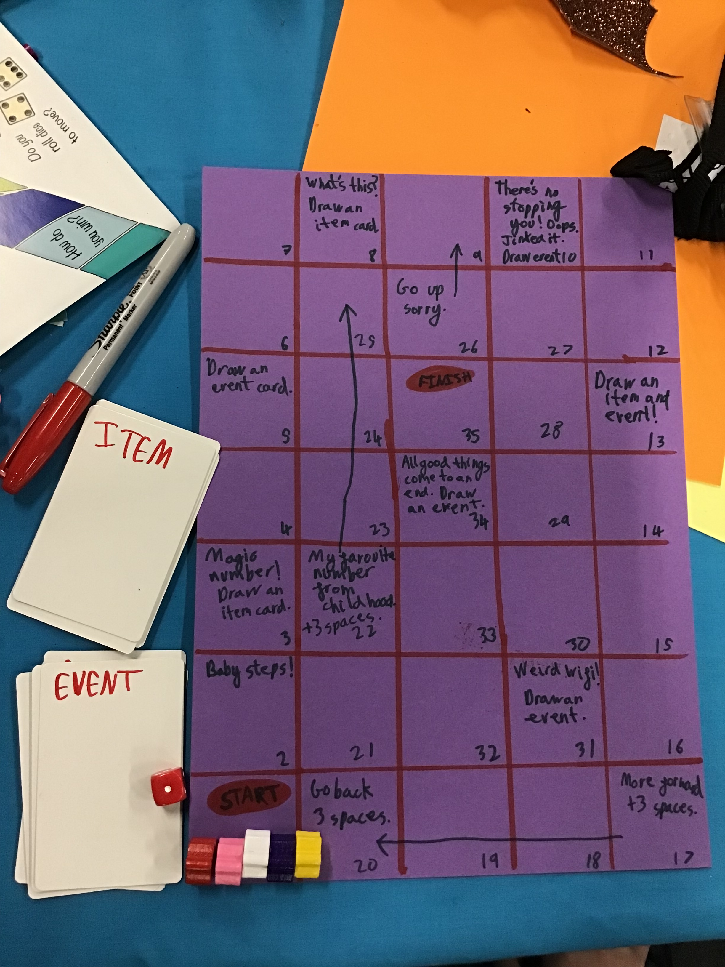 Some amazing ideas can emerge when you give people paper, pens, and a handful of components. I’ve seen kids make race games where you roll the number of dice you won in your last turn, or whether you roll multiple dice and give some to your opponent. I’ve also seen amazing prototypes from 9-year-olds and 12-year-olds.